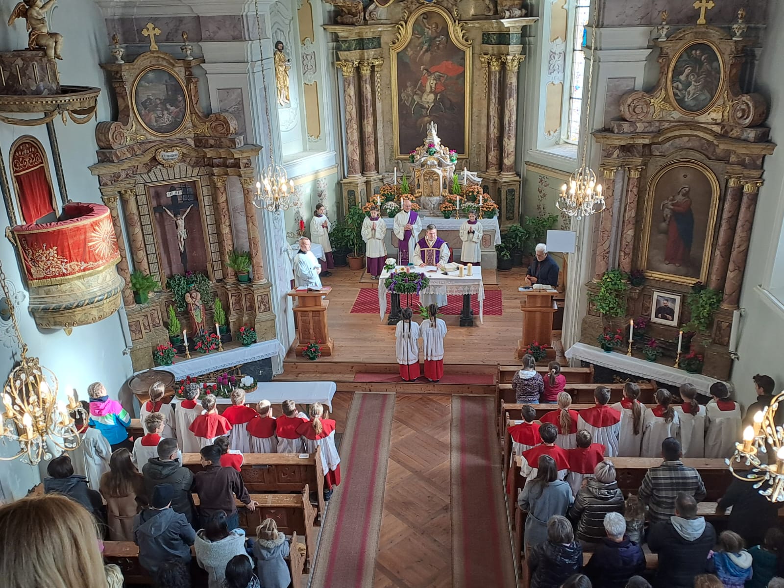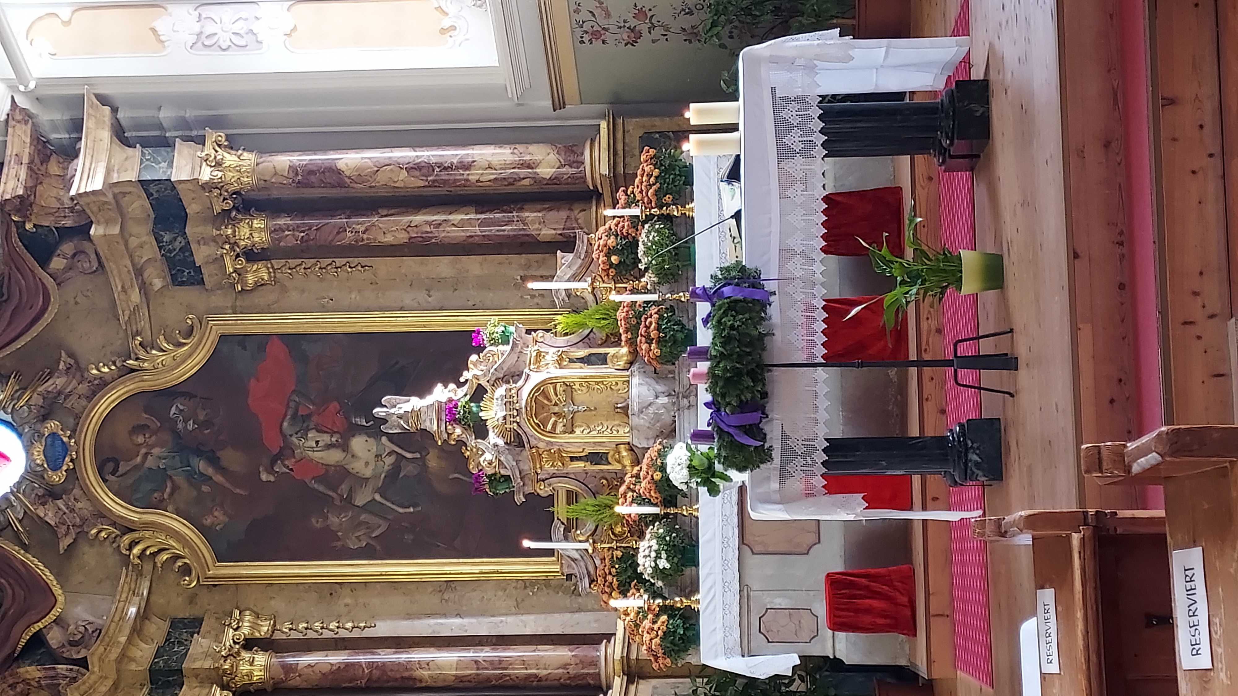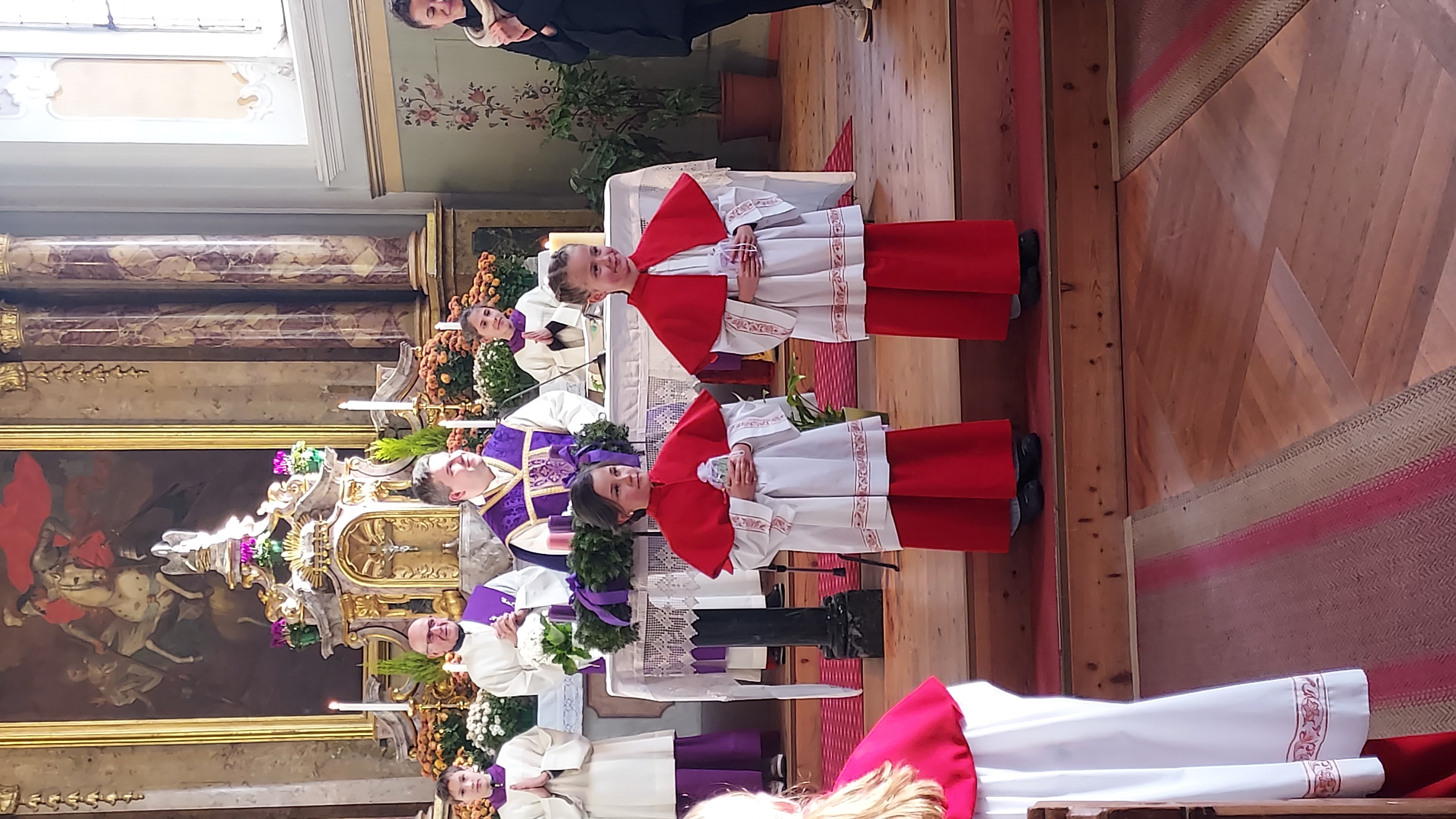 Die heilige Messe findet normalerweise jeden Sonntag um 10.00 Uhr in der Pfarrkirche zum heiligen Georg statt (Uhrzeiten können variieren bzw. auch Gottesdienste ausfallen). Weitere Informationen zu den Gottesdiensten finden Sie im jeweiligen Pfarrblatt.
