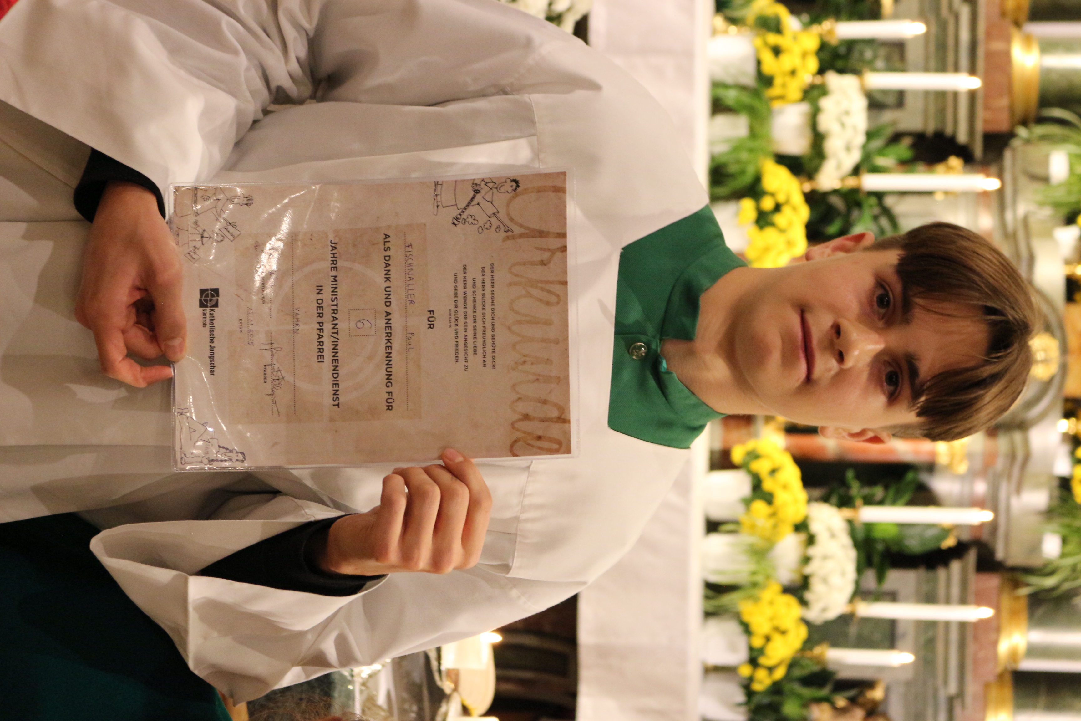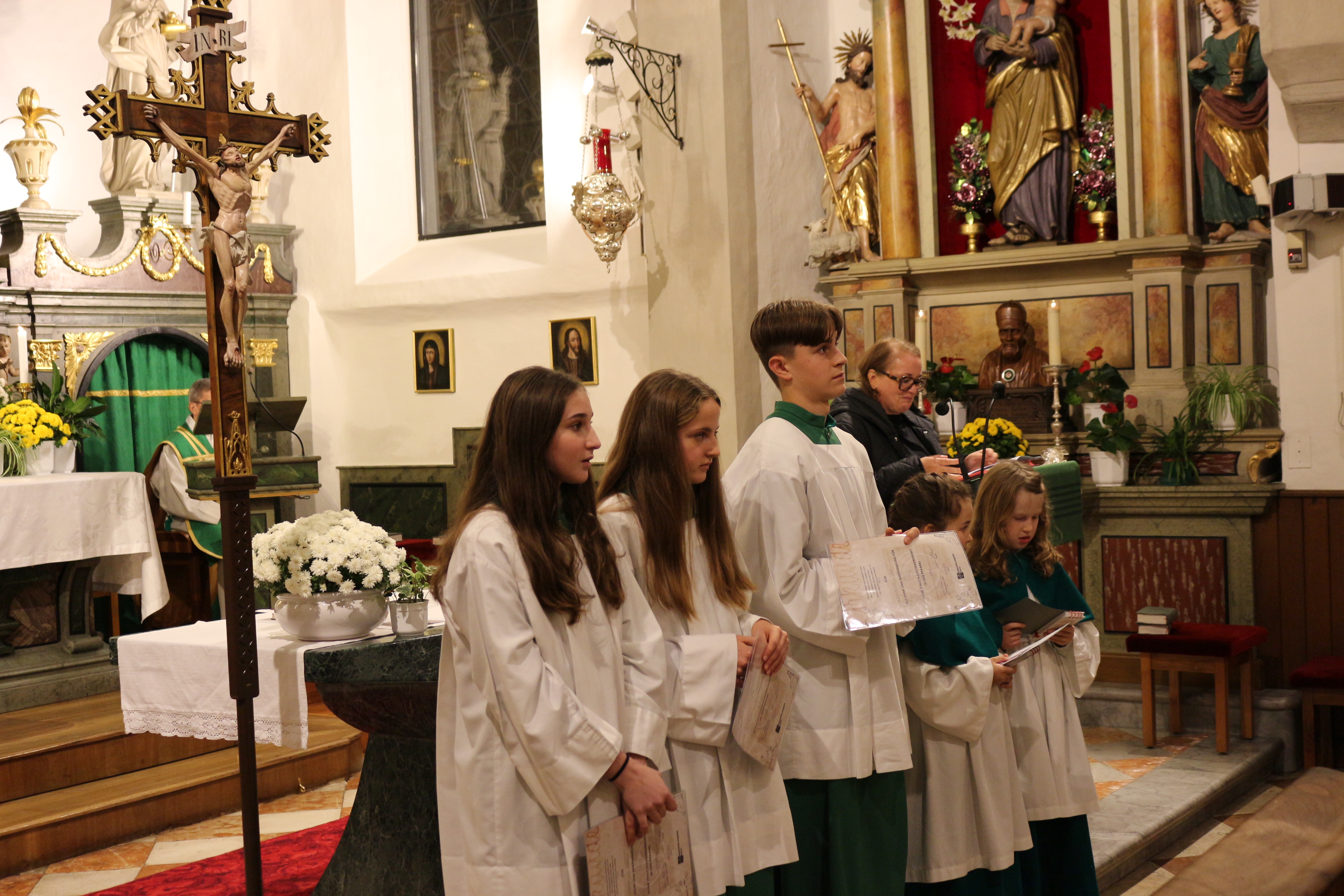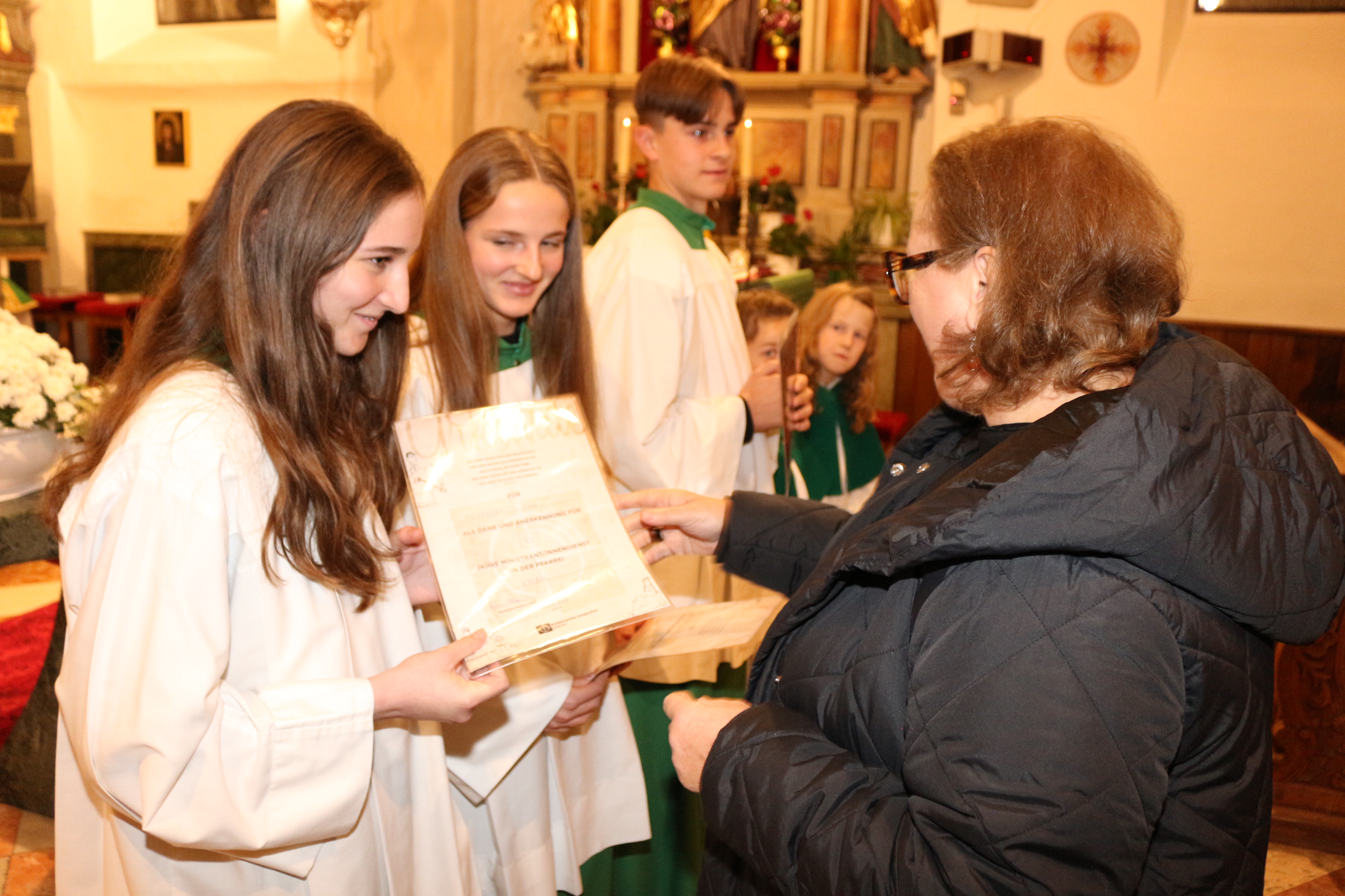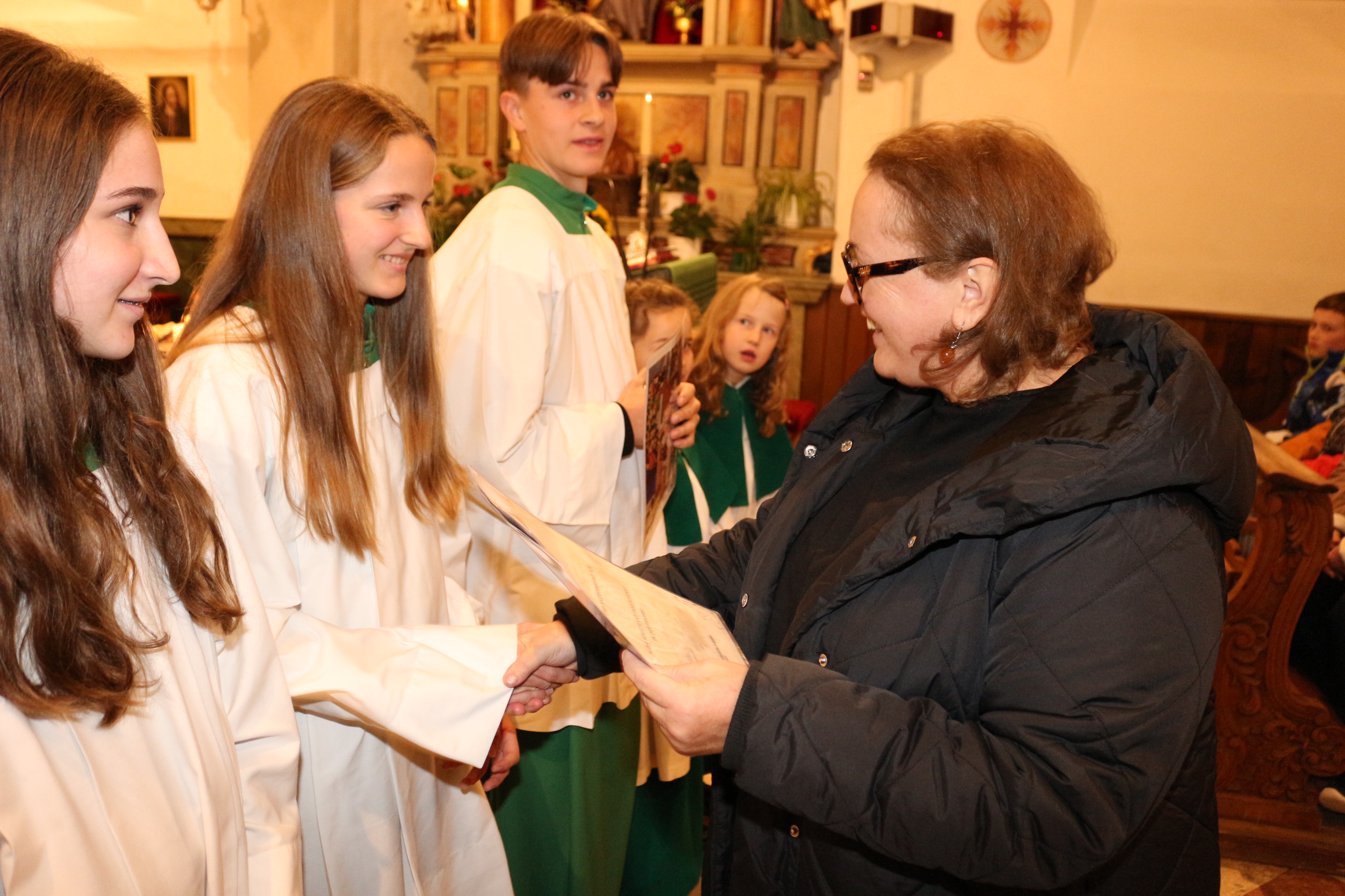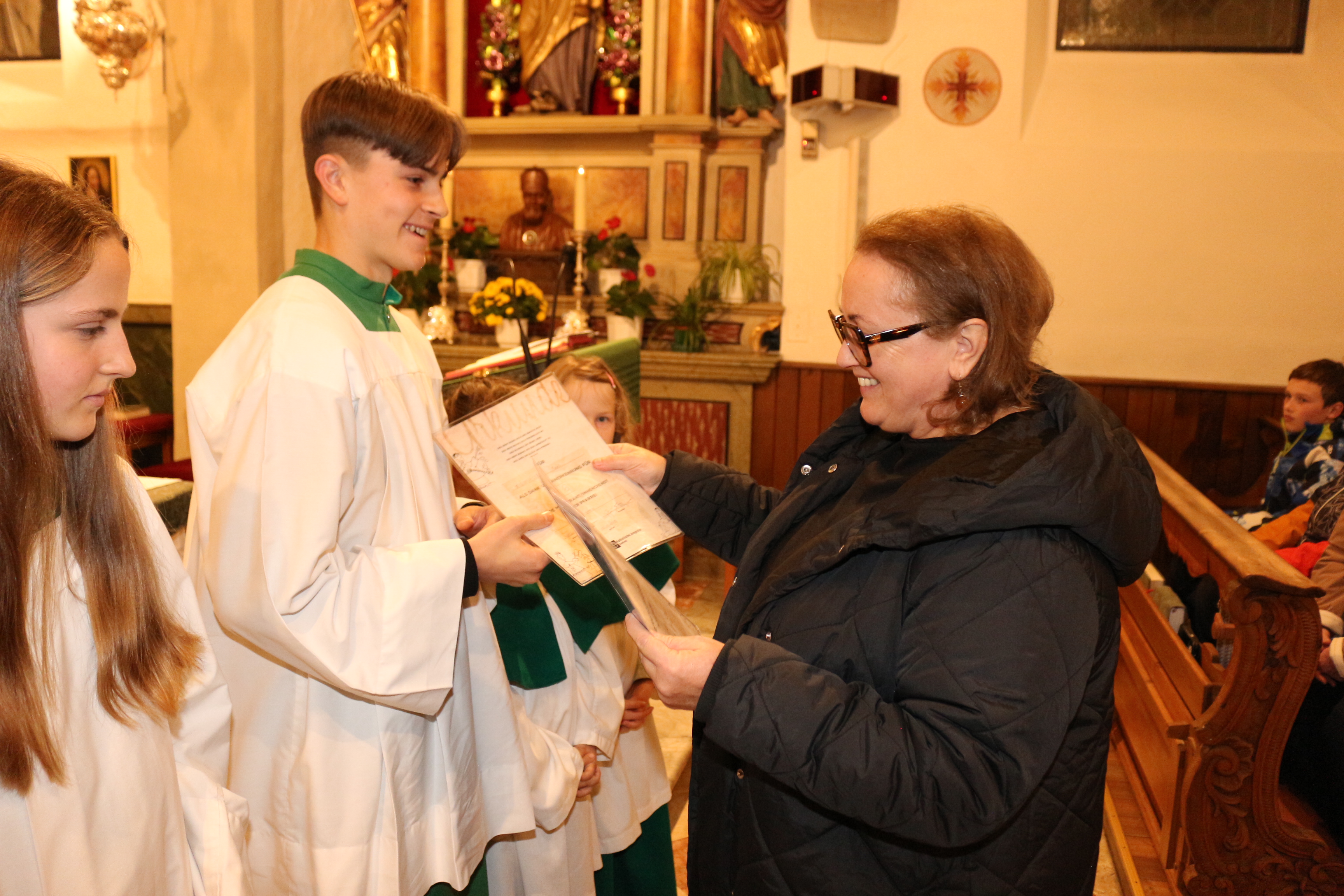 An Sonntag, 12. Oktober haben wir Erntedank gefeiert und in diesem Rahmen der langjährigen, nunmehr pensionierten Religionslehrerin Margith Watschinger eine kleine Ehrung zuteil kommen lassen. 33 Jahre lang hat sie in vahrn Religionsunterricht gehalten und in dieser Zeit stets auch die Kinder auf die Erstkommunion vorbereitet. Für diesen Dienst an den Kindern und an der Pfarrgemeinde sind wir ihr zu großem Dank verfplichtet.